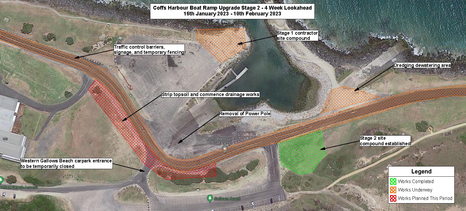 Work on Stage 2 of the Boat Ramp began on 16 January 2023. The diagram below indicates changes you will be seeing over the next four weeks.