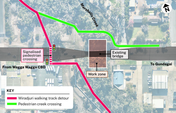 The first stage of work will involve closing access to the Wiradjuri Walking Track under the bridge and establishing a pedestrian crossing on the Sturt Highway, managed with temporary traffic lights.