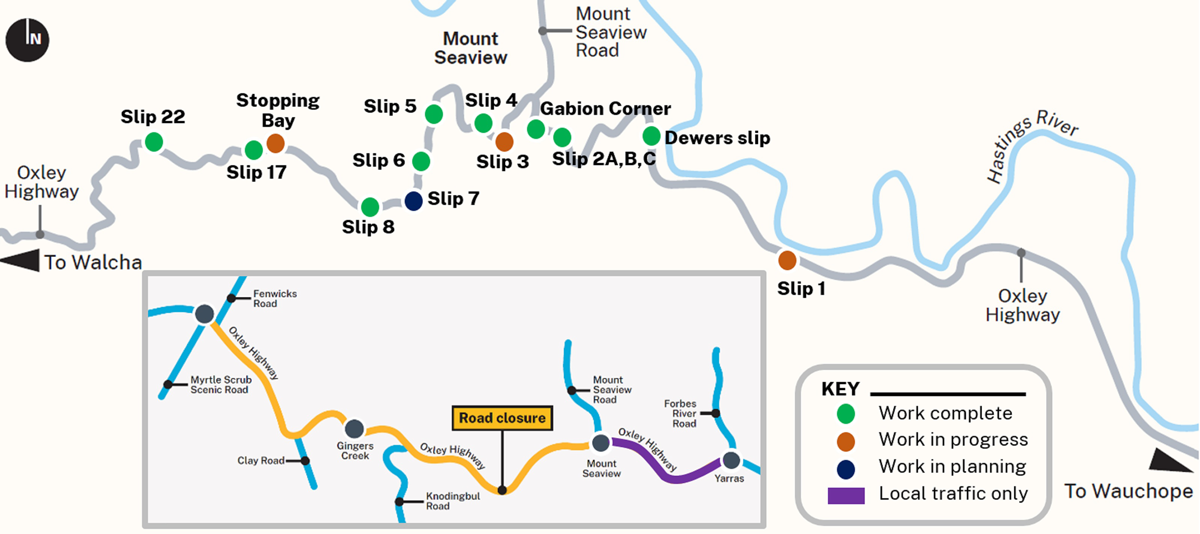 Work to repair slope and pavement damage on the Oxley Highway at Mount Seaview will be on going. Weekly road closures on the Oxley Highway will be in place until November 2025, closure times are: