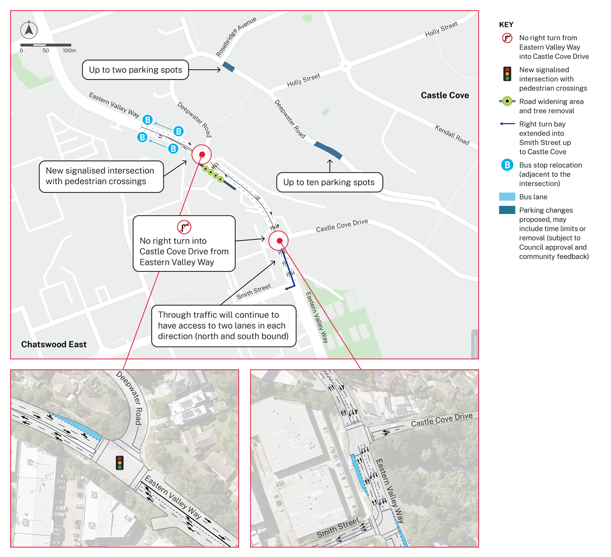 - removing the existing right turn movement from Eastern Valley Way into Castle Cove Drive to allow improved northbound traffic flow on Eastern Valley Way, particularly during peak periods